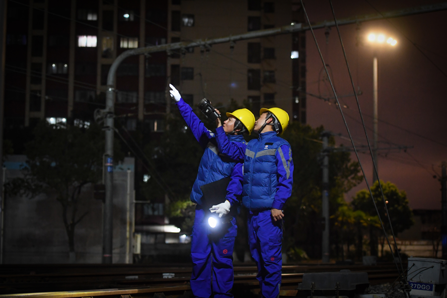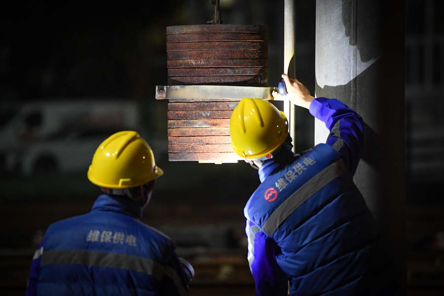 地铁维保供电触网运维人员正在检查下锚补偿装置,保障列车受电顺畅。