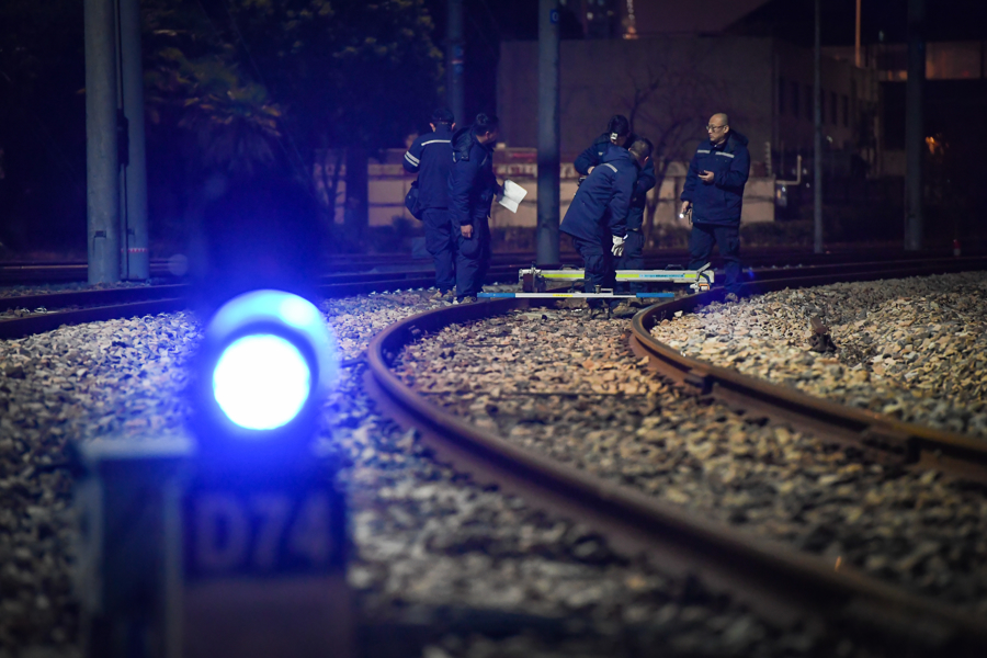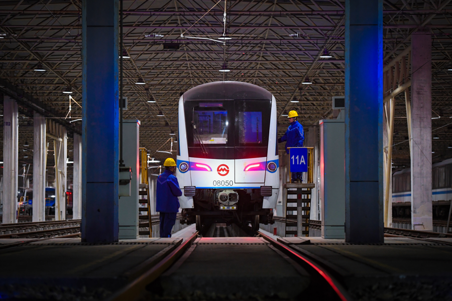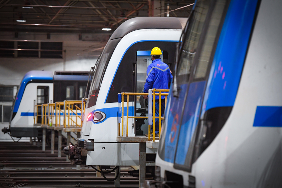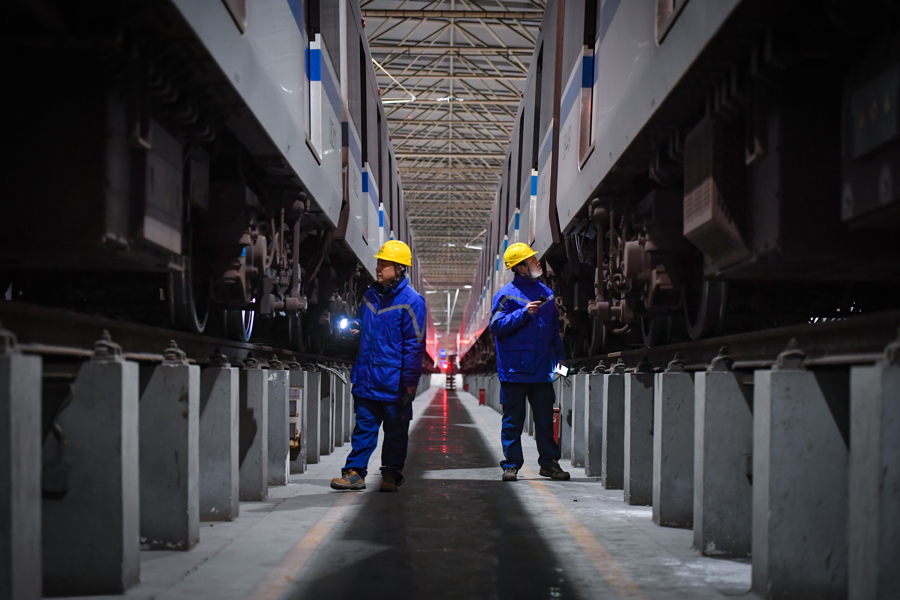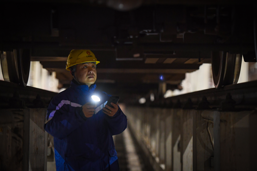 地铁维保车辆专业人员正在进行车辆日检两侧检查。