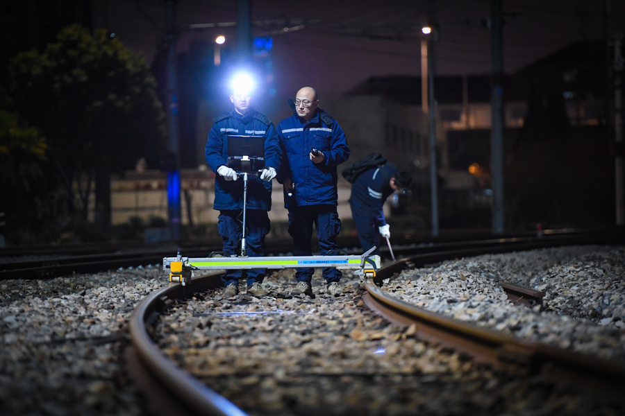 地铁维保工务专业人员正在使用轨检仪检查轨道平顺性。