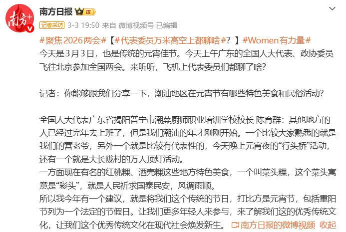 世界东谈主大代表、广东省揭阳普宁市潮菜厨师干事培训学校校长陈育群默示:“我本年有一个建议,即是将咱们传统的节日,打比喻是元宵节,包括重阳节列为法定的节沐日。让咱们更多年青东谈主来参与,来了解咱们这的优秀传统文化,让咱们这个优秀传统文化在当代社会欢乐重生。”