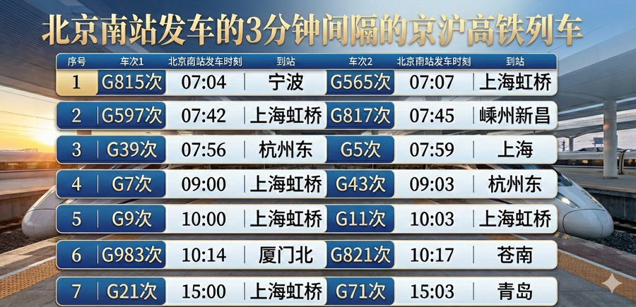 据悉,北京南站共有7组京沪高铁列车实现3分钟间隔连续发车,涵盖前往上海虹桥、上海、杭州东、宁波、嵊州新昌、厦门北、苍南、青岛等方向,集中分布在早高峰及日间重点时段,进一步提升干线通达能力。