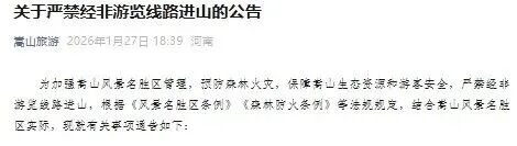 1月27日,嵩山旅游发布“关于严禁经非游览线路进山的公告”。