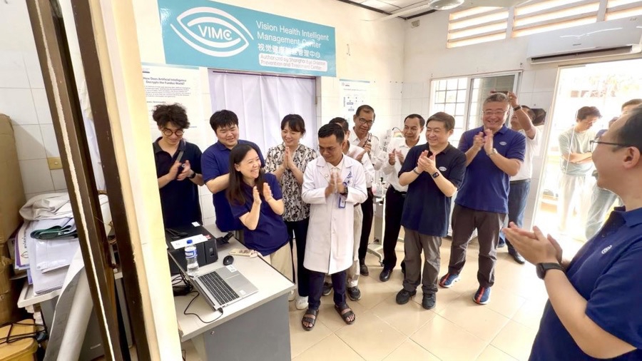 视觉健康智能管理中心(VIMC)作为视觉健康服务“上海模式”的生动实践,以智慧化、标准化、一站式服务为核心,通过人工智能、物联网、大数据等新兴技术赋能,聚焦人群高发和常见眼病,强化早期干预,实施动态连续的视觉健康分级分类管理。在柬埔寨Kampong Speu省Kong Pisey医院和Kandal省Techo Sen Koh Thom医院,两家VIMC仅用一周时间就完成了从建设到试运行的全过程,更是展现出视觉健康服务的“上海速度”。