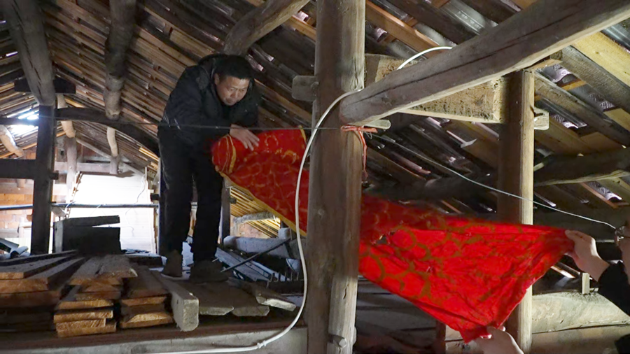 杨梓镇乡村的龙,藏着诸多世代相传的典礼感。比如,每年农历六月初六,要将龙布、龙具拿出来曝晒防潮。几十年来,吴水贵都将父亲留住的龙头、龙布全心藏在老屋子阁楼,这既是对父亲的漫骂,更藏着他“趁着还有劲(气),思带着孩子再舞一次龙”的期盼。